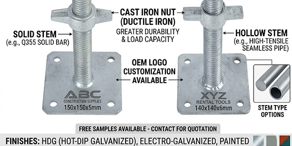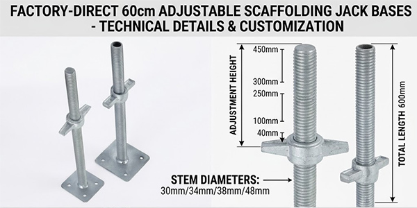 Le base de vérin d'échafaudage Le vérin de votre échafaudage, au niveau du sol, constitue le principal point de contact avec le sol et le point d'appui le plus critique de la structure. système d'échafaudageLes bases de vérins se fixent à la base des montants d'échafaudage et existent en différentes tailles. Elles servent à lever et abaisser l'échafaudage à l'aide de tiges filetées et à le niveler sur des terrains accidentés afin de garantir sa verticalité et sa stabilité.