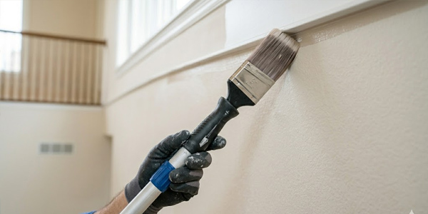 - Pour peindre les bords depuis le sol, il est nécessaire d'utiliser un prolongateur de pinceau pivotant. Cet outil permet de bloquer le pinceau à un angle précis. En effectuant un mouvement lent et régulier et en chargeant le pinceau d'une quantité minimale de peinture, on peut créer une ligne nette à la jonction du mur et du plafond sans jamais quitter le sol.
