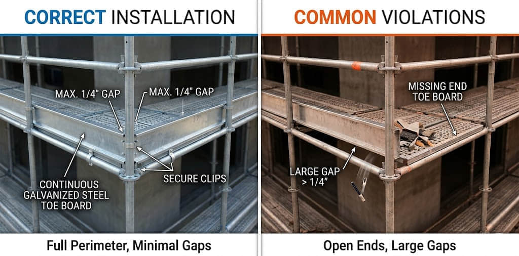 Les systèmes de protection contre les chutes d'objets, tels que décrits dans la norme OSHA 1926.451(h), exigent que des plinthes soient installées pour être conformes si les employés sont tenus de se trouver dans ou de passer sous l'échafaudage.