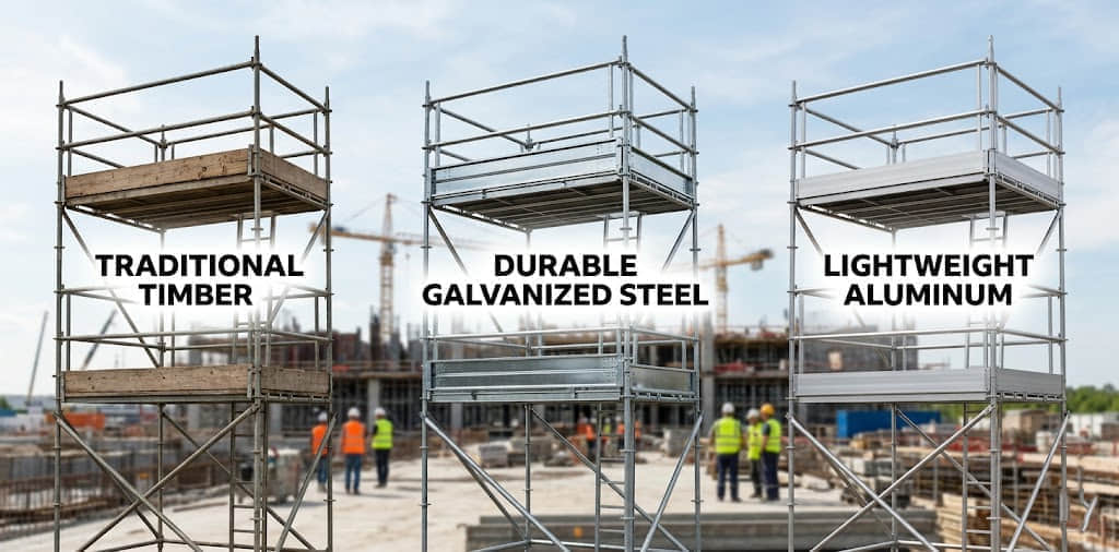 Bois d'œuvre | Économique et facile à découper pour s'adapter aux formes d'échafaudages personnalisées. | Sensible à la pourriture, aux fissures et au gauchissement ; nécessite des inspections fréquentes. |