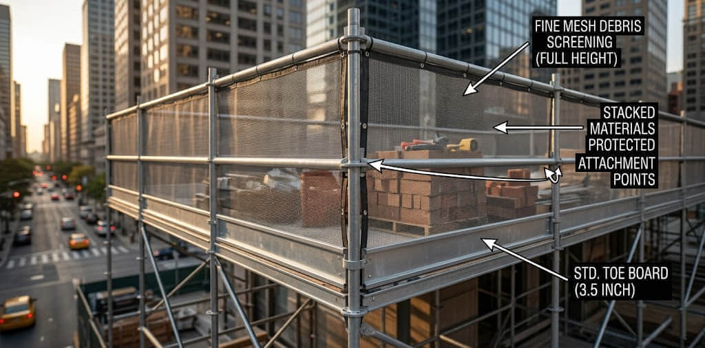- Intégration avec le filetDans les zones urbaines à fort trafic, utilisez conjointement des plinthes et des filets de protection contre les débris (type « éventail »). Les plinthes empêcheront les charges importantes (par exemple, les matériaux lourds qui tombent au sol), et les filets retiendront les débris plus fins (par exemple, la poussière et les particules).